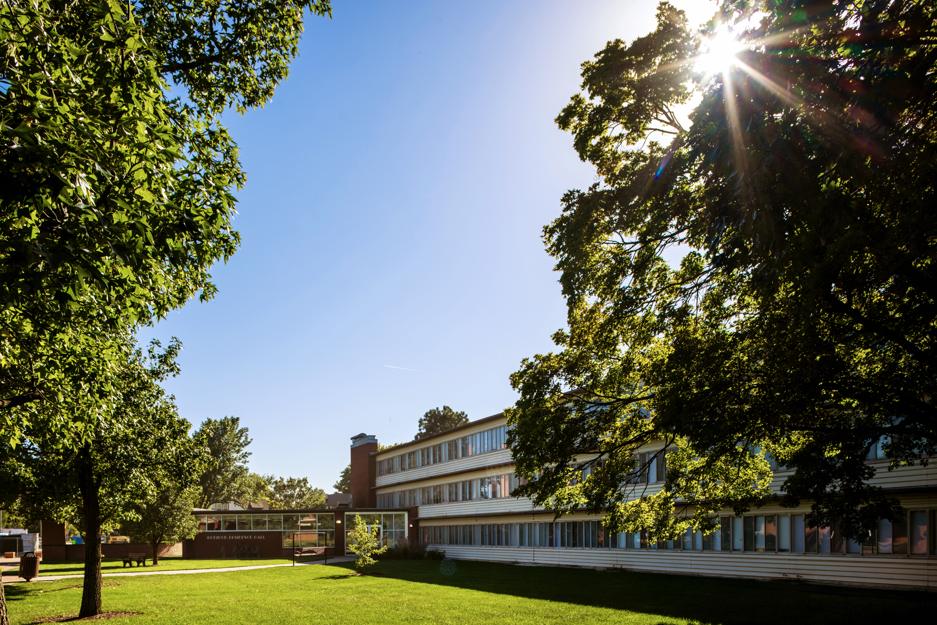 Dotzour is a three-floor, co-ed residence hall with common spaces including kitchens and free-laundry machines. Dotzour Hall rooms were renovated in 2023.